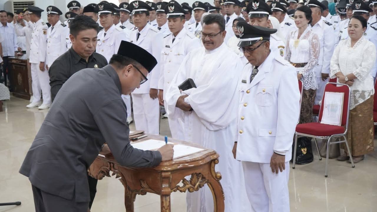 Morowali Utara, Bupati Morowali Dr. dr. Delis Julkarson Hehi MARS, melantik 5 Kepala Desa (Kades) sekaligus memperpanjangan masa jabatan para Kades se-Kabupaten Morowali Utara, di Ruang Pola Kantor Bupati, pada Rabu, (10/09/2025).