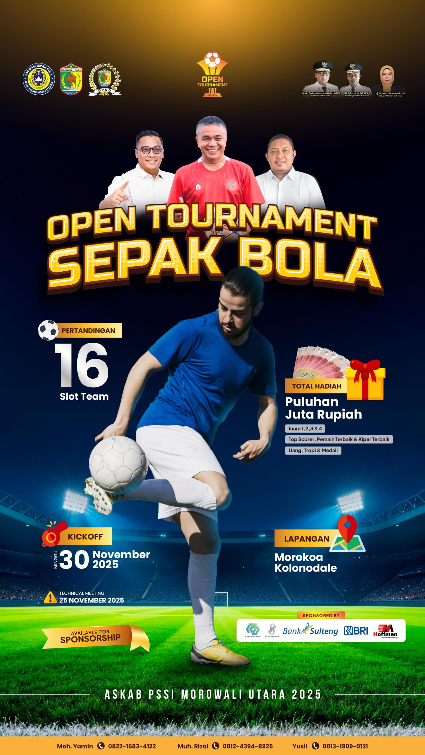 Morowali Utara – Open Turnamen Sepak Bola ASKAB PSSI Morowali Utara 2025 resmi mencatat antusiasme tinggi setelah seluruh kuota peserta terpenuhi. Sebanyak 16 tim yang berasal dari Morowali Utara dan sejumlah daerah tetangga telah menyatakan kesiapan mengikuti turnamen yang dijadwalkan berlangsung pada Desember 2025 di Lapangan Morokoa, Kolonodale.