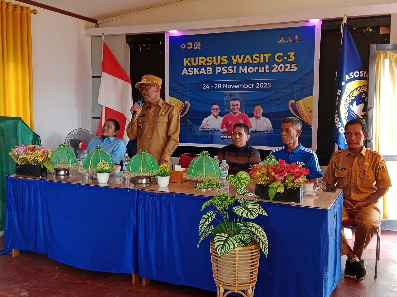 Morowali Utara ,Wakil Bupati Morowali Utara, H. Djira K., S.Pd., M.Pd., secara resmi membuka Kursus Wasit C-3 yang digelar Asosiasi Sepakbola Kabupaten (Askab) PSSI Morowali Utara. Kegiatan ini berlangsung selama lima hari, mulai 24 hingga 28 November 2025, bertempat di Aula Nayla Hotel.