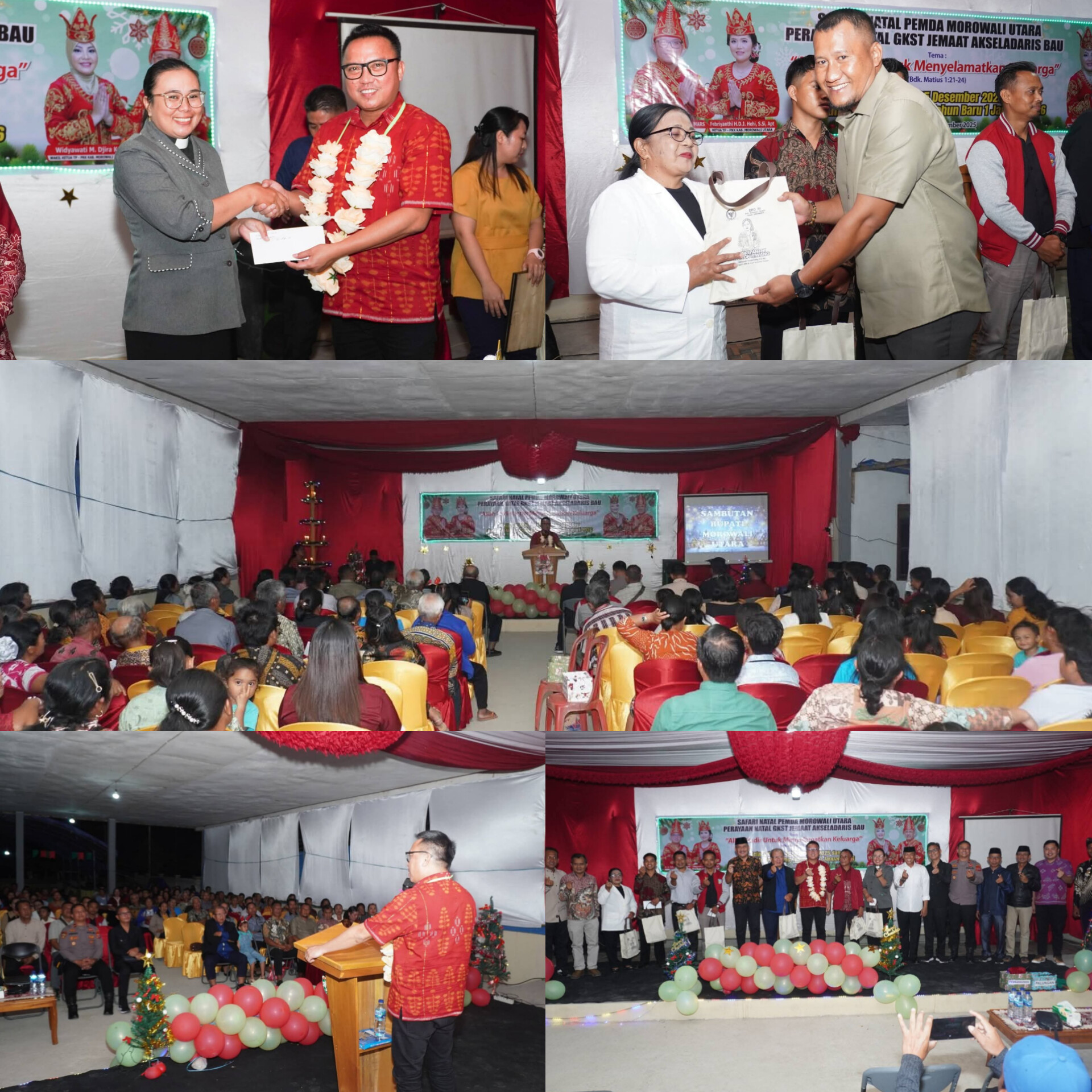 Morowali Utara, Rangkaian Safari Natal Pemerintah Daerah Kabupaten Morowali Utara di seluruh kecamatan resmi berakhir di GKST Akseladaris BAU, Kecamatan Soyojaya, Kamis (19/12/2025). Kegiatan ini dihadiri langsung oleh Bupati Morowali Utara Dr. dr. Delis Julkarson Hehi, MARS, bersama jajaran pemerintah daerah.