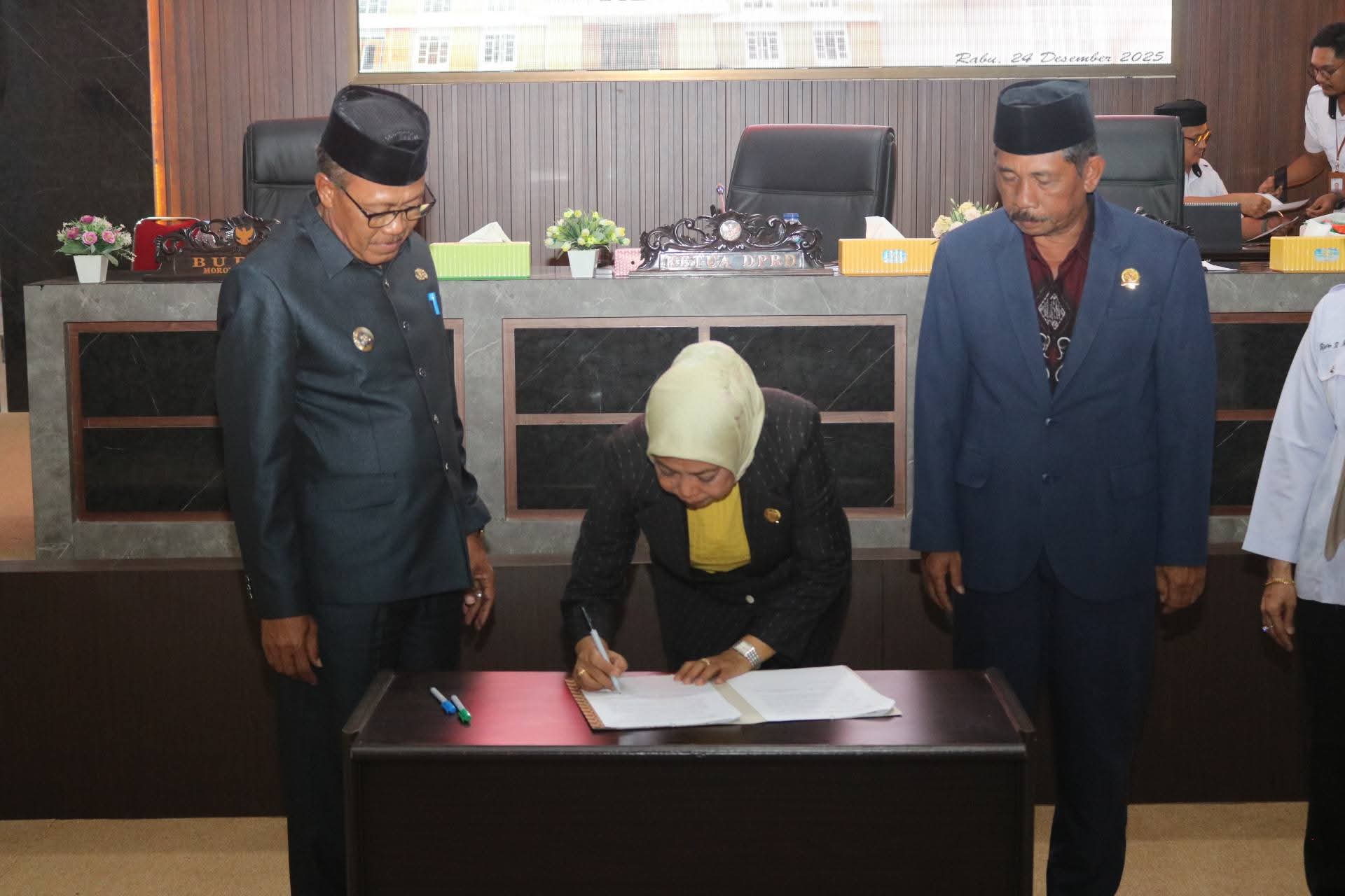 penandatanganan persetujuan bersama, serta penutupan Masa Persidangan I Tahun Sidang 2025–2026. Kegiatan ini berlangsung di Ruang Rapat Paripurna DPRD Morowali Utara, Rabu (24/12/2025).