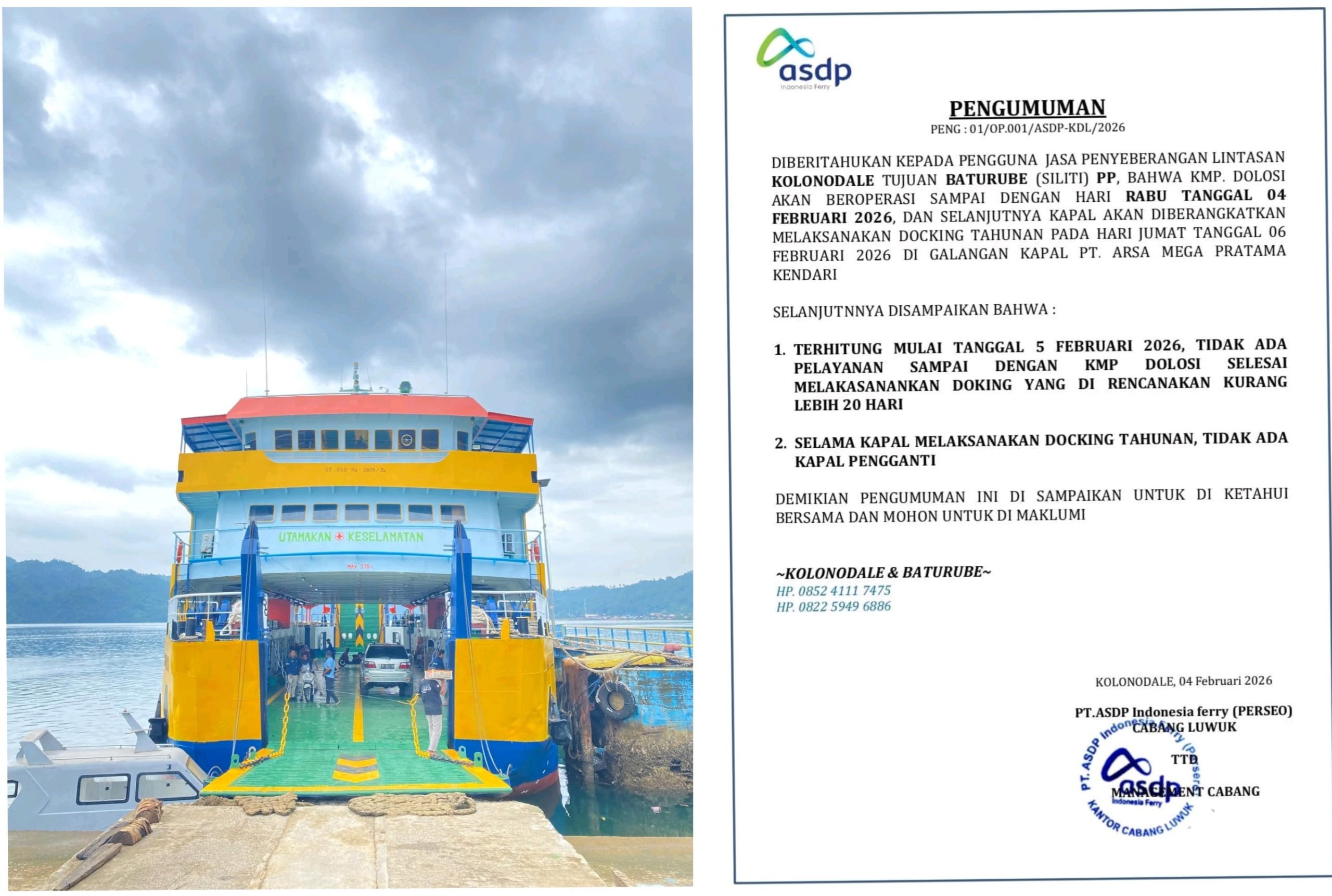Morowali Utara , PT ASDP Indonesia Ferry mengumumkan bahwa layanan penyeberangan Lintasan Kolonodale–Baturube (Siliti) Pulang–Pergi menggunakan KMP Dolosi akan dihentikan sementara mulai Kamis, 5 Februari 2026.