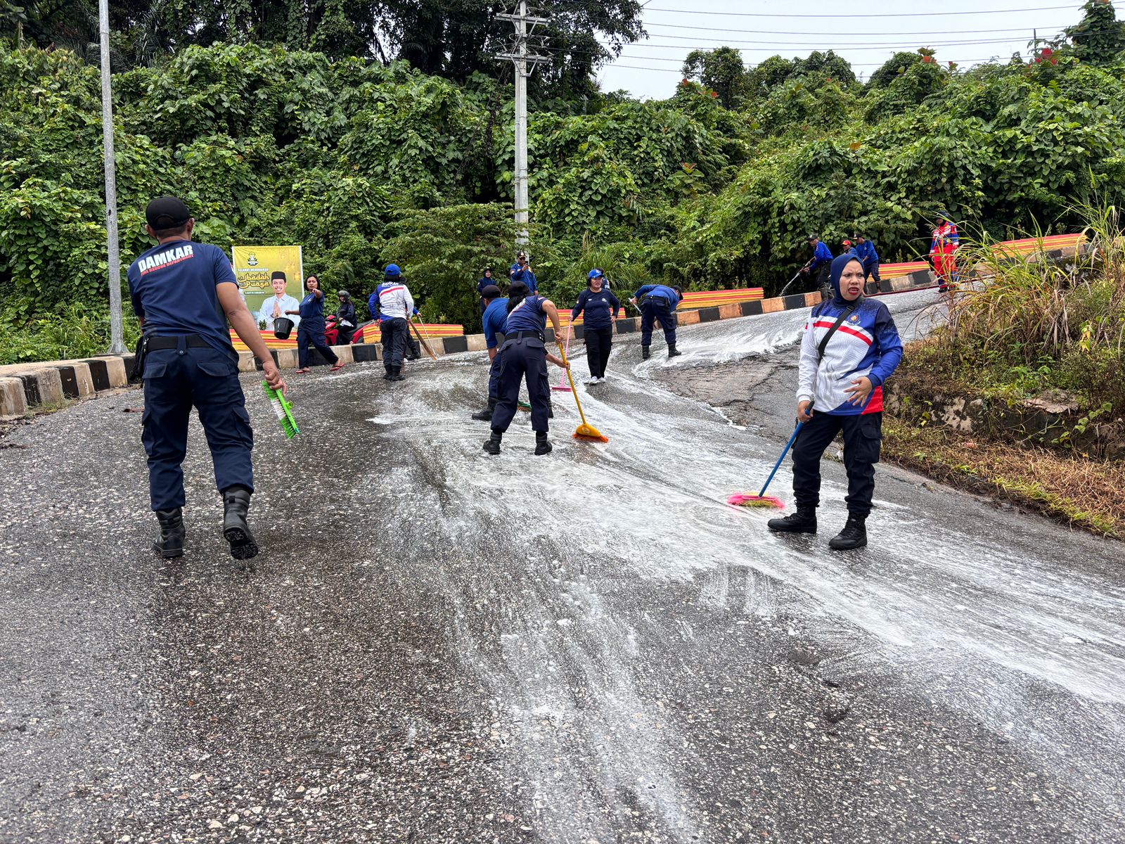 Petugas gabungan kemudian melakukan tindakan cepat dengan membersihkan tumpahan solar di badan jalan guna mencegah terjadinya kecelakaan lanjutan serta mengembalikan kondisi jalan agar aman dilalui pengguna jalan.