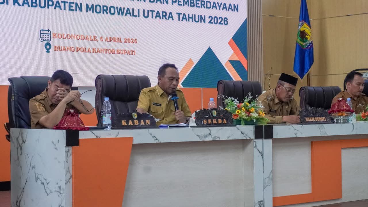 Morowali Utara, Wakil Bupati Morowali Utara, H. Djira K., S.Pd., M.Pd., secara resmi membuka rapat koordinasi (Rakor) dalam rangka optimalisasi penyelenggaraan pemerintahan, pelaksanaan pembangunan, pelayanan, serta pemberdayaan masyarakat. Kegiatan tersebut berlangsung di Ruang Pola Kantor Bupati, Senin (6/4/2026).